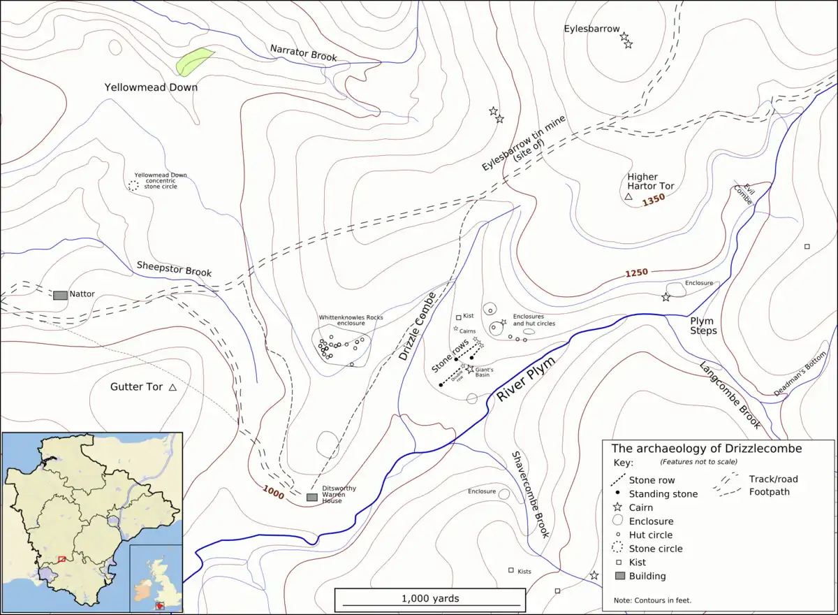 Drizzlecombe is located on the western side of Dartmoor, about 4 miles (6.4 km) east of the village of Yelverton, to the west of the upper reaches of the River Plym.