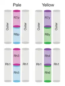 148. 1 2 3 Chou WH, Hall KJ, Wilson DB, Wideman CL, Townson SM, Chadwell LV, Britt SG (December 1996). "Identification of a novel Drosophila opsin reveals specific patterning of the R7 and R8 photoreceptor cells". Neuron. 17 (6): 1101–1115. doi:10.1016/s0896-6273(00)80243-3. PMID 8982159. S2CID 18294965.