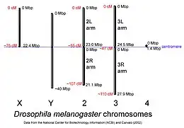 D. melanogaster chromosomes to scale with megabase-pair references oriented as in the National Center for Biotechnology Information database, centimorgan distances are approximate and estimated from the locations of selected mapped loci.