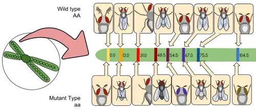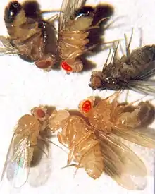 • w: white- Drosophila melanogaster wild type typically expresses a brick red eye color. The white eye mutation in fruit flies is caused due to the absence of two pigments associated with red and brown eye colors; peridines (red) and ommochromes (brown).[59] In January 1910, Thomas Hunt Morgan first discovered the white gene and denoted it as w. The discovery of the white-eye mutation by Morgan brought about the beginnings of genetic experimentation and analysis of Drosophila melanogaster. Hunt eventually discovered that the gene followed a similar pattern of inheritance related to the meiotic segregation of the X chromosome. He discovered that the gene was located on the X chromosome with this information. This led to the discovery of sex-linked genes and also to the discovery of other mutations in Drosophila melanogaster.[67] The white-eye mutation leads to several disadvantages in flies, such as a reduced climbing ability, shortened life span, and lowered resistance to stress when compared to wild type flies.[68] Drosophila melanogaster has a series of mating behaviors that enable them to copulate within a given environment and therefore contribute to their fitness. After Morgan's discovery of the white-eye mutation being sex-linked, a study led by Sturtevant (1915) concluded that white-eyed males were less successful than wild-type males in terms of mating with females.[69] It was found that the greater the density in eye pigmentation, the greater the success in mating for the males of Drosophila melanogaster.[69]