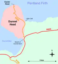 The headland's boundary with the rest of the Scottish mainland can be defined as a north–south line running from Little Clett (ND220740) to the mouth of Dunnet Burn (ND217709) in Dunnet Bay. This line is followed along most of its route by a single track road, the B855, which links Brough with the village of Dunnet, making this the most northerly road on mainland Britain. From this line, the headland projects westward and northward into the Atlantic Ocean and the Pentland Firth and shelters the more southerly waters of Dunnet Bay.