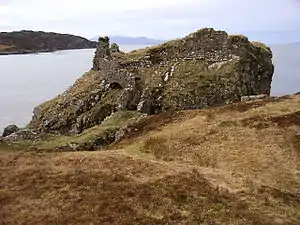 Dunscaith Castle also known as Dun Scaich, Dun Sgathaich Castle and Tokavaig, is a ruined castle on the coast of the Isle of Skye, in the north-west of Scotland. It is located in the Parish of Sleat, in the Highland council area, and in the former county of Inverness-shire, at grid reference NG595120. Also called "Fortress of Shadows", it is the legendary home of the warrior maiden Scáthach, after whom it is named.[1][2] It is protected as a scheduled monument.[3]