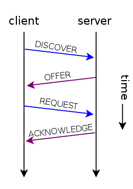 An illustration of a typical non-renewing DHCP session; each message may be either a broadcast or a unicast, depending on the DHCP client capabilities.[8]
