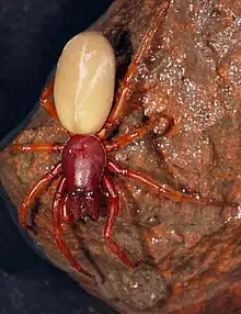 Adults have a reddish-brown body and legs, and can grow up to 2 centimetres (0.79 in) long. Females are generally larger growing from 1.1 to 1.5 centimetres (0.43 to 0.59 in), while males are about 0.9 to 1 centimetre (0.35 to 0.39 in).[4] Their six eyes are close together in an oval shape, and they have eight reddish legs, the second pair facing backward.[3]