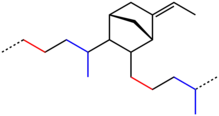 Idealized EPDM polymer, red = ethylene-derived; blue = propylene-derived; black = ethylidene norbornene-derived