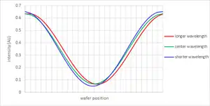 The EUV mask absorber, due to partial transmission, generates a phase difference between the 0th and 1st diffraction orders of a line-space pattern, resulting in image shifts (at a given illumination angle) as well as changes in peak intensity (leading to linewidth changes)[71][72] which are further enhanced due to defocus.[73][74] Ultimately, this results in different positions of best focus for different pitches and different illumination angles. Generally, the image shift is balanced out due to illumination source points being paired (each on opposite sides of the optical axis). However, the separate images are superposed and the resulting image contrast is degraded when the individual source image shifts are large enough. The phase difference ultimately also determines the best focus position.