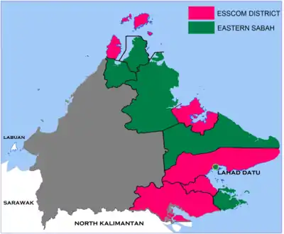 The Eastern Sabah Security Command (ESSCOM) is a Malaysian security area that covers 1,400 km of the east coast of Sabah from Kudat to Tawau.[1] It was established by Malaysian Prime Minister Dato' Seri Najib bin Abdul Razak and announced on 7 March 2013 by Musa Aman, the Sabah State Chief Minister.[2] Its purpose is to strengthen maritime security in the eastern part of Sabah following the persistent attacks by pirates and militants in the southern Philippines especially after the 2013 Lahad Datu standoff, while at the same time ensuring that trade and business activity are not affected.[1] The ESSCOM headquarters and main bases is at Lahad Datu.