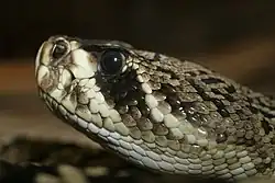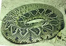 Other common names for this snake species include eastern diamond-backed rattlesnake,[5] eastern diamondback,[4] diamond rattlesnake, diamond-back rattlesnake, common rattlesnake, diamond-back, diamond(-patch) rattler, eastern diamond-back (rattlesnake), eastern diamond rattlesnake, Florida diamond-back (rattlesnake), Florida rattlesnake, lozenge-spotted rattlesnake, rattler, rattlesnake, southeastern diamond-backed rattlesnake, southeastern diamond-backed rattler, southern woodland rattler, timber rattler, water rattle, water rattlesnake,[17] and diamondback rattlesnake.[3]