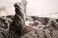 Individual disposition varies, with some allowing close approach while remaining silent, and others starting to rattle at a distance of 6–9 m (20–30 ft).[16] The rattle is well developed and can be heard from relatively far away. When threatened, it raises the anterior half of the body off the ground in an S-shaped coil, and can strike to a distance of at least a third of its body length.[33] Many will stand their ground and may strike repeatedly, but if given the opportunity, they will usually retreat while facing the intruder and moving backwards towards shelter, after which they disappear.[3][31][33]