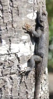 The eastern fence lizard (Sceloporus undulatus) is a medium-sized species of lizard in the family Phrynosomatidae.[3] The species is found along forest edges, rock piles, and rotting logs or stumps in the eastern United States. It is sometimes referred to as the prairie lizard, fence swift, gray lizard, gravid lizard, northern fence lizard or pine lizard.[4] It is also referred to colloquially as the horn-billed lizard. One of its most notable behaviors is that of its escape behavior when encountering fire ants.