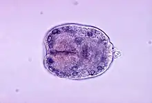 Echinococcus granulosus, also called the hydatid worm, hyper tape-worm or dog tapeworm, is a cyclophyllid cestode that dwells in the small intestine of canids as an adult, but which has important intermediate hosts such as livestock and humans, where it causes cystic echinococcosis, also known as hydatid disease. The adult tapeworm ranges in length from 3 mm to 6 mm and has three proglottids ("segments") when intact—an immature proglottid, mature proglottid and a gravid proglottid.[1] The average number of eggs per gravid proglottid is 823. Like all cyclophyllideans, E. granulosus has four suckers on its scolex ("head"), and E. granulosus also has a rostellum with hooks. Several strains of E. granulosus have been identified, and all but two are noted to be infective in humans.[2]