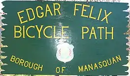 The Edgar Felix Bikeway is a 5.4 miles (8.7 km) rail trail in New Jersey between Manasquan and Allaire State Park. The trail was constructed on a former roadbed of the Farmingdale and Squan Village Railroad and the Freehold and Jamesburg Agricultural Railroad.