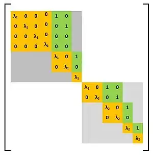 The image shows an example of a general Weyr matrix consisting of two blocks each of which is a basic Weyr matrix. The basic Weyr matrix in the top-left corner has the structure (4,2,1) and the other one has the structure (2,2,1,1).