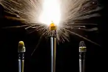 To operate an electric match, a source of electricity of appropriate voltage and current is needed to provide current to the match. When sufficient electric current is passed through the bridgewire, the resistive heating causes the element to rise above the ignition temperature of the pyrogen, and the pyrogen begins to burn.[1][3]