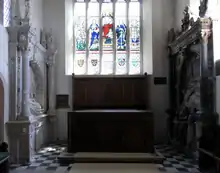 View into the chancel of Bovey Tracey Church, showing on the south (right) the monument to Elize Hele and on the north, place of greatest honour (left), Nicholas Eveleigh, whose widow Alice Bray remarried to Hele. The arms of Bray appear on both monuments