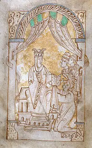 After Cnut's death, Emma continued to participate in politics during the reigns of her sons by each husband, Harthacnut and Edward the Confessor. In 1035, when her second husband Cnut died and was succeeded by their son Harthacnut, who was in Denmark at the time, Emma was designated to act as his regent until his return,[4] which she did in rivalry with Harold Harefoot. Emma is the central figure within the Encomium Emmae Reginae, a critical source for the history of early-11th-century English politics. As Catherine Karkov notes, Emma is one of the most visually represented early medieval queens.[5]