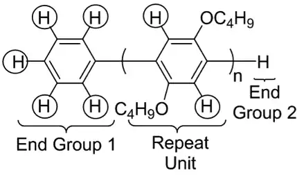 The advantage of NMR for end groups is that it allows for not only the identification of the end group units, but also allows for the quantification of the number-average length of the polymer.[7] End-group analysis with NMR requires that the polymer be soluble in organic or aqueous solvents. Additionally, the signal on the end-group must be visible as a distinct spectral frequency, i.e. it must not overlap with other signals. As molecular weight increases, the width of the spectral peaks also increase. As a result of this, methods which rely on resolution of the end-group signal are mostly used for polymers of low molecular weight (roughly less than 20,000 g/mol number-average molecular weight).[8] By using the information obtained from the integration of a 1H NMR spectrum, the degree of polymerization (Xn) can be calculated. With knowledge of the identity of the end groups/repeat unit and the number of protons contained on each, the Xn can then be calculated. For this example above, once the 1H NMR has been integrated and the values have been normalized to 1, the degree of polymerization is calculated by simply dividing the normalized value for the repeat unit by the number of protons continued in the repeat unit. For this case, Xn = n = 100/2, and therefore Xn = 50, or there are 50 repeat units in this monomer.