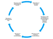 The process of endotoxin entering the bloodstream can be intensified by various lesions of the intestinal mucosa and by dysbacteriosis, which is accompanied by translocation of bacteria and products of their life activity into the small intestine[19] and as a result of antibiotic-induced death of Gram-negative microflora and the release of large amounts of endotoxin.[20] It should be particularly emphasized that various stressful situations (severe seizures, burns, trauma, etc.) cause damage to the mucous membrane of the gastrointestinal tract. This damage occurs due to redistribution of energy and structural resources of the body, i.e. transfer from systems not involved in adaptation to the stress factor to systems providing adaptation.[21] An increase in the concentration of endotoxin in the blood exceeding the physiological norm leads to a pathological condition known as endotoxin aggression. Endotoxin aggression is a universal factor in the pathogenesis of human diseases, the development of which is caused by an excess of endotoxin entering the general bloodstream and a lack of endotoxin-binding systems (Tabolin V. А., Yakovlev M. Yu.).[22][23][24][25][26][27] Excess endotoxin causes endothelial damage[28] in the microcirculatory vessels of the intestinal mucosa and leads to the development of mucosal ischemia. This, in turn, causes further damage to the mucosa and a weakening of the intestinal barrier.