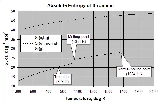 Absolute entropy of strontium. The solid line refers to the entropy of strontium in its normal standard state at 1 atm pressure. The dashed line refers to the entropy of strontium vapor in a non-physical state.