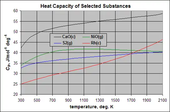 Molar heat capacity of four substances in their designated states at 1 atm pressure. CaO(c) and Rh(c) are in their normal standard state of crystalline solid at all temperatures. S2(g) is a non-physical state below about 882 K and NiO(g) is a non-physical state at all temperatures.