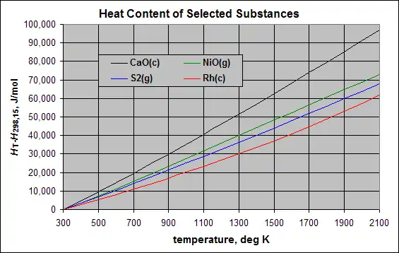 Molar heat content of four substances in their designated states above 298.15 K and at 1 atm pressure. CaO(c) and Rh(c) are in their normal standard state of crystalline solid at all temperatures. S2(g) is a non-physical state below about 882 K and NiO(g) is a non-physical state at all temperatures.