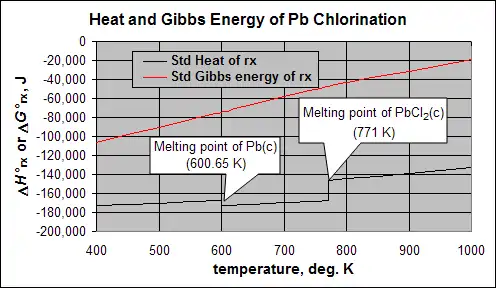 The ΔH°rx shows discontinuities at the melting points of Pb (600.65 K) and PbCl2 (771 K). ΔG°rx is not discontinuous at these phase transition temperatures, but does undergo a change in slope, which is almost imperceptible on the chart.