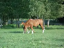 Horses are adapted to run, allowing them to quickly escape predators, and possess an excellent sense of balance and a strong fight-or-flight response. Related to this need to flee from predators in the wild is an unusual trait: horses are able to sleep both standing up and lying down, with younger horses tending to sleep significantly more than adults.[4] Female horses, called mares, carry their young for approximately 11 months and a young horse, called a foal, can stand and run shortly following birth. Most domesticated horses begin training under a saddle or in a harness between the ages of two and four. They reach full adult development by age five, and have an average lifespan of between 25 and 30 years.