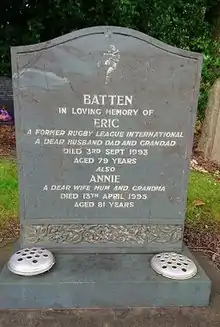Eric Batten was the son of the rugby league footballer Billy Batten. Eric Batten's marriage to Annie (née Saxton, born c.1914 in Wakefield district – died aged 81 on 13 April 1995) was registered during first 14 1937 in Wakefield district.[14] They had children; John Michael Batten (birth registered third 14 1940 in Hemsworth district) Janet Batten (birth registered first 14 1951 (age 7273) in Hemsworth district), and Gaynor Batten (birth registered second 14 1953 (age 7071) in Hemsworth district). He was buried at Lawnswood Cemetery, Leeds.