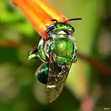 Green orchid bees are varying shades of glossy metallic green and can grow to a length of about 1.3 cm (0.5 in). The membranous wings are dark-coloured and translucent and the female has pollen baskets on her hind legs. The male has an enlarged joint on his hind leg where there is a pit for storing substances he gathers from plants. The female but not the male possesses a sting which can be used on more than one occasion but which is not as painful to humans as a honeybee's sting. This bee is very agile in the air, hovering for lengthy periods and darting between flowers. It might be confused with sweat bees in the family Halictidae, such as Augochloropsis, but orchid bees have very much longer proboscises in order to gather nectar from flowers with long corolla tubes.[1]