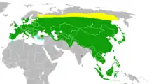 The Eurasian tree sparrow's natural breeding range comprises most of temperate Europe and Asia south of about latitude 68°N (north of this the summers are too cold, with July average temperatures below 12 °C (54 °F)) and through Southeast Asia to Java and Bali. It formerly bred in the Faroes, Malta and Gozo.[4][5] In South Asia it is found mainly in the temperate zone.[19][20] It is sedentary over most of its extensive range, but northernmost breeding populations migrate south for the winter,[21] and small numbers leave southern Europe for North Africa and the Middle East.[4] The eastern subspecies P. m. dilutus reaches coastal Pakistan in winter and thousands of birds of this race move through eastern China in autumn.[5]