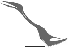 The authors established some distinctive traits, all present in the cervical vertebrae. The third neck vertebra has three-quarters of the length of the fourth vertebra, whereas 60 percent would be normal with azhdarchids. The necks of the prezygapophyses, the front joint processes, are well-developed and elongated, obliquely pointing forwards and outwards under an angle of 30 degrees with the long axis of the vertebra. The preexapophysis, a secondary joint process on the side of the prezygapophysis, is well-developed with a forward pointing articulation facet and separated from a process, itself the remains of the diapophysis and possibly a neck rib, on the outer base of the prezygapophysis, by a deep trough on its underside. The pneumatic openings, the entrance holes for the air sacks, at the sides of the neural arch are small and placed in a low position.[1]