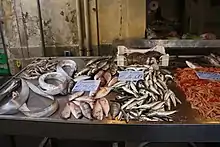 European pilchards, center right, are the cheapest thing for sale at this fish stall in Syracuse, Sicily