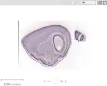 A search was performed on the Allen Brain Atlas using FAM149A. According to the levels of expression provided by the Atlas, FAM149A is not expressed in notable levels within the mouse brain. However, with visual observation of the figure, FAM149A could be found in the ventral posterior complex of the thalamus. This can be seen as the dark vertical line in the center of the sagittal brain slice in the image below. As a comparison, the expression of the protein, actin, is used to demonstrate what a mouse brain appears like with high levels of expression.[14]