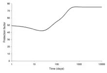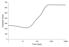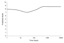 The protection factor provided by 30 cm of concrete shielding where the source is the idealised Chernobyl fallout.[40]