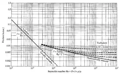 For the turbulent flow regime, the relationship between the Fanning friction factor and the Reynolds number is more complex and is governed by the Colebrook equation[6] which is implicit in :