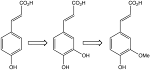 In a proposed ferulic acid biosynthetic pathway for Escherichia coli, L-tyrosine is converted to 4-coumaric acid by tyrosine ammonia lyase, which is converted to caffeic acid by Sam5, which is then converted to ferulic acid by caffeic acid methyltransferase.[18]