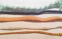 Examples of fingerloop braids. The top three are yarn. The bottom two are embroidery thread.