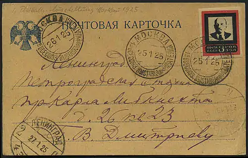 Postcard sent from the exhibition to Leningrad, with the USSR stamp from the Lenin Mourning issue of 1924, and exhibition's special cancellation