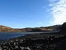 A small river, Alt Ribhein (meaning 'Ribbon River') runs into the bay at its south-east while Fiskavaig Burn makes its way into the bay at its west.