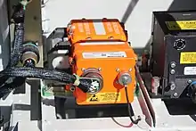 A modern flight data recorder; the underwater locator beacon is the small cylinder on the far right. (Translation of warning message in French: "Flight recorder do not open".) The warning appears in English on the other side.