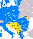 Croatia finished accession negotiations on 30 June 2011, and on 9 December 2011, signed the Treaty of Accession.[23] A referendum on EU accession was held in Croatia on 22 January 2012, with 66% of participants voting in favour of joining the Union.[24][25][26][27] The ratification process was concluded on 21 June 2013, and entry into force and accession of Croatia to the EU took place on 1 July 2013.[28]