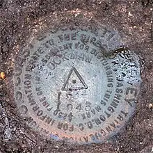 The geodetic disk (PID MY0039) set in the ground above the galleries of Battery Gardner at Fort Ruckman. Its approximate position is marked on the map above.