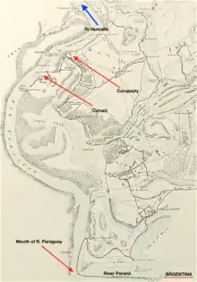 Before even arriving at the Vuelta de Humaitá an invading squadron would first have to navigate the River Paraguay from its mouth, and run the gauntlet of such batteries as the Paraguayans were able to deploy on its left bank, particularly at Curuzú and Curupayty. Whether unarmoured warships could have done so without being sunk was never ascertained; during the War the unarmoured wooden vessels of the Imperial Brazilian Navy did not attempt it.[83]
