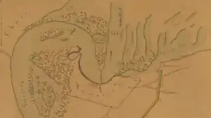 A view of the Fortress of Humaitá before the War (horizontally scroll). This elevation, probably sketched in 1857 by the future Admiral Ernest Mouchez aboard the French naval vessel Bisson,[55] whom the Paraguayan government accused of spying,[56] is one of the few depictions of the fortress as a working installation. (Most images that have survived were made after it was captured and partly demolished by the Allies.) Towards the left is the Londres battery with its characteristically wide gun embrasures. The sketch does not appear to show a chain boom. This copy of the French sketch was made by Brazilian naval intelligence at the Arsenal de Marinha do Rio de Janeiro in 1857 and survives in the National Library of Brazil.