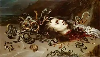 Collaborations with Rubens were particularly frequent. Snyders' expressiveness and ability to render different textures of furs and skins excited the admiration of Rubens. Rubens frequently employed him to paint animals, fruit and still life in his own pictures.[5] Snyders developed a particularly close collaborative relationship with Rubens between 1610 and 1640. Their collaborative efforts are well documented. In the early period of their collaboration, Rubens would paint an oil sketch of the complete composition and mark out clearly where Snyders would have to put his contribution. This has been documented for the painting The Recognition of Philopoemen. It is possible that in this early period Rubens was not sure about Snyders' compositional skills and wanted to show him the way. In the later Prometheus bound the process was reversed and Snyders made a sketch leaving the space for the figure by Rubens.[16] The Recognition of Philopoemen is considered the first Baroque still life with figures.[17] A famous collaboration between Rubens and Snyders is the Medusa (Kunsthistorisches Museum, Vienna). Painted around 1613–1617/1618, this small-scale work showed that Snyders' manner was not only well suited to Rubens' large pieces, but also adaptable to his smaller-scale works.[18] Rubens relied on Snyders to create the visual richness that went hand in hand with his Baroque style, which stressed abundance and bounteousness. The two artists' brushwork was so close that contemporaries had difficulty distinguishing their contributions in collaborative works.[7]
