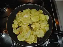 Fried potatoes are a dish or a component of other dishes (such as Bauernfrühstück) essentially consisting of potatoes which have been fried or deep-fried in hot cooking oil often with the addition of salt and other seasonings. They are often served as a side dish.