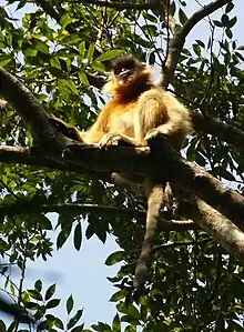The Hainan black crested gibbon is among the rarest and most endangered apes. Endemic to the island of Hainan, there are fewer than 30 individuals left in the Bawangling National Nature Reserve.[9] Like many other gibbons, male Hainan black crested gibbons are black in color while females are golden brown. The eastern black crested gibbon is nearly as rare with only 20 or so in the Guangxi Zhuang Autonomous Region along with 30 in neighboring Vietnam.[9] About 99% of this ape's habitat in China has been lost.[9]