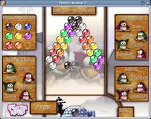 Frozen Bubble's protagonist is a penguin a la Tux, the mascot of Linux and popular feature in many free software/open-source games. In this game, Tux has to shoot colored frozen bubbles to form groups of the same color. Such groups disappear and the object is to clear the whole screen in this way before a bubble passes a line at the bottom. There is a single player mode and a multiplayer mode via Split screen, LAN and Internet. The game features 100 levels and includes a level editor.[2]