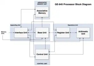 The GE 645 mainframe computer was a development of the GE 635 for use in the Multics project. This was the first computer that implemented a configurable hardware protected memory system. It was designed to satisfy the requirements of Project MAC to develop a platform that would host their proposed next generation time-sharing operating system (Multics) and to meet the requirements of a theorized computer utility.[1] The system was the first truly symmetric multiprocessing machine to use virtual memory, it was also among the first machines to implement what is now know as a translation lookaside buffer.[2][3][4] The foundational patent for which was granted to John Couleur and Edward Glaser.[5]