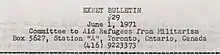 There was one other short-lived case of a GI underground paper getting permission to conduct antiwar activity on a military base. The staff of the well named Where Are We? out of Fort Huachuca in Arizona requested and received permission to gather signatures on an antiwar petition on the base. They even set up tables in front of the main base exchange, or retail store, where in one day, July 31, 1971, they gathered 540 signatures, including "143 Vietnam veterans and twenty-three officers." That was the end of thatthe base command never let them do it again.[2]:86